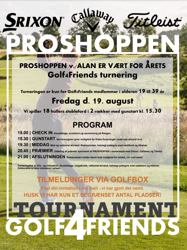 Alan shop arrangerer og sponserer en turnering for Golf4Friends medlemmer. Turneringen afholdes fredag d. 19. august. Tilmelding via golfbox…